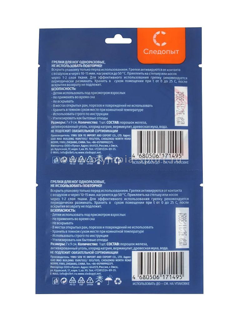 Грелки для ступней ног СЛЕДОПЫТ самонагревающиеся, 9х7 см (уп. 2 шт)